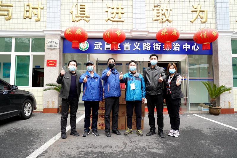 黃鶴樓街道黨工委書記劉曉明,街道辦事處主任山峰,首義路街辦事處主任李愛武,徐家棚街道黨工委書記金光偉,黨政辦副主任熊菊花代表各自單位接受物資。