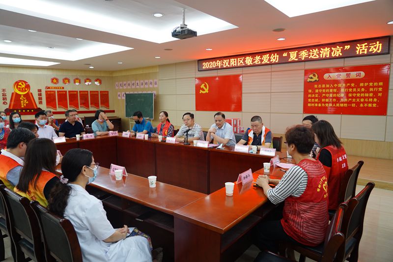 8月9日,漢陽區敬老愛幼“夏季送清涼”活動在漢陽區琴斷口街七里一村社區舉行,區民政局黨委書記、局長、區慈善會常務副會長劉漢華,琴斷口街道辦事處黨工委書記趙亮出席會議。武漢市漢陽醫院紀委書記易喜祥,黃鶴樓酒業副總經理兼總會計師麻玉俠作為愛心企業代表參加會議。
