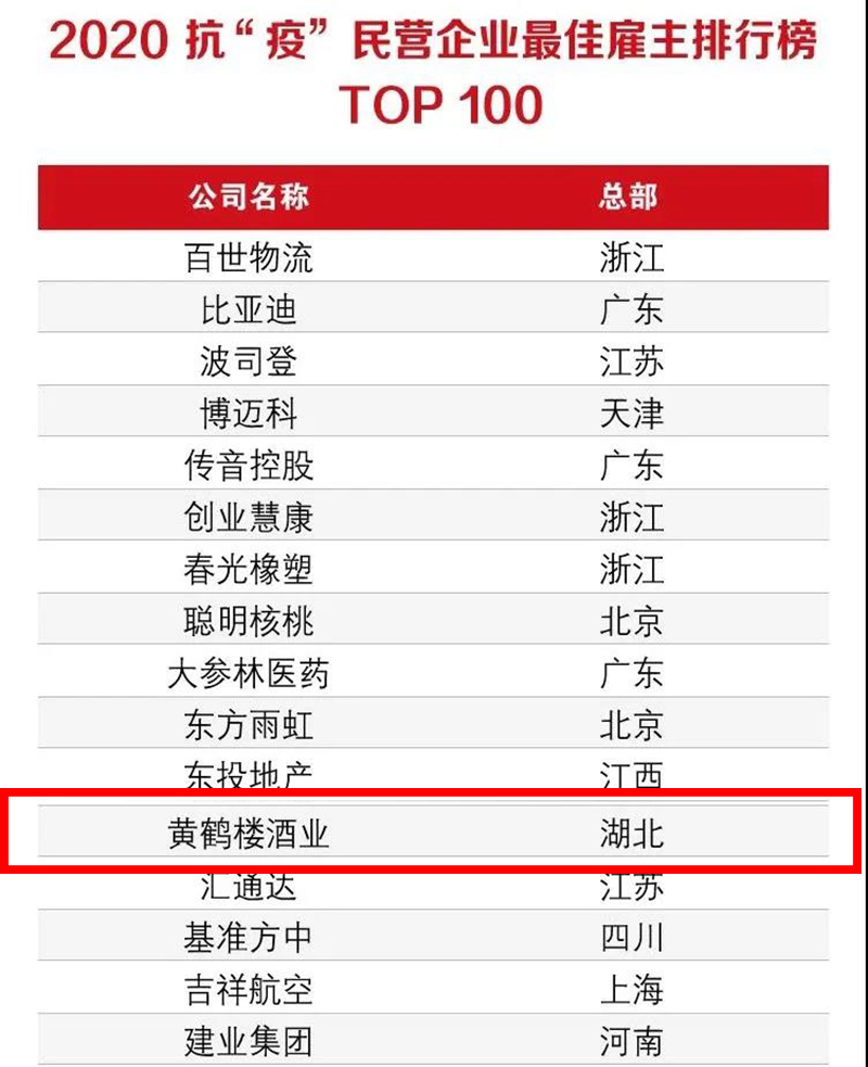 10月30日,胡潤百富、百富天啟和前程無憂三方聯(lián)合發(fā)布2020抗“疫”民營企業(yè)最佳雇主排行榜TOP100,黃鶴樓酒業(yè)名列其中,為湖北省唯一一家上榜企業(yè)。