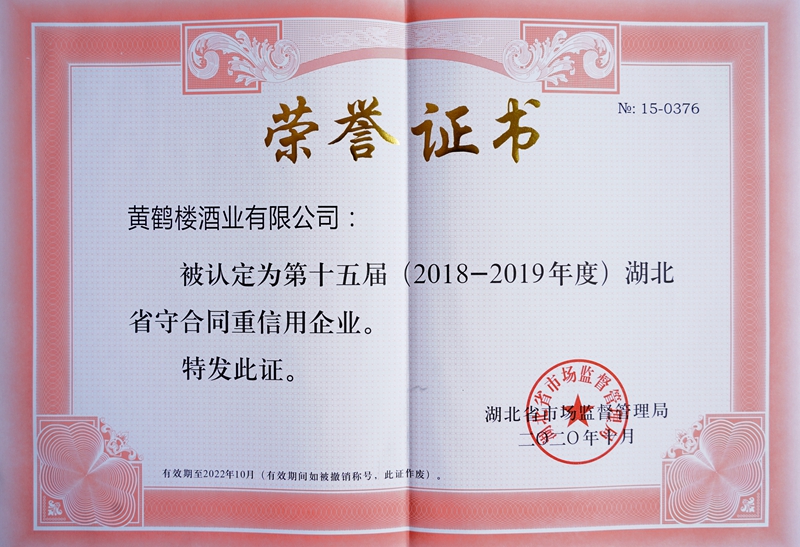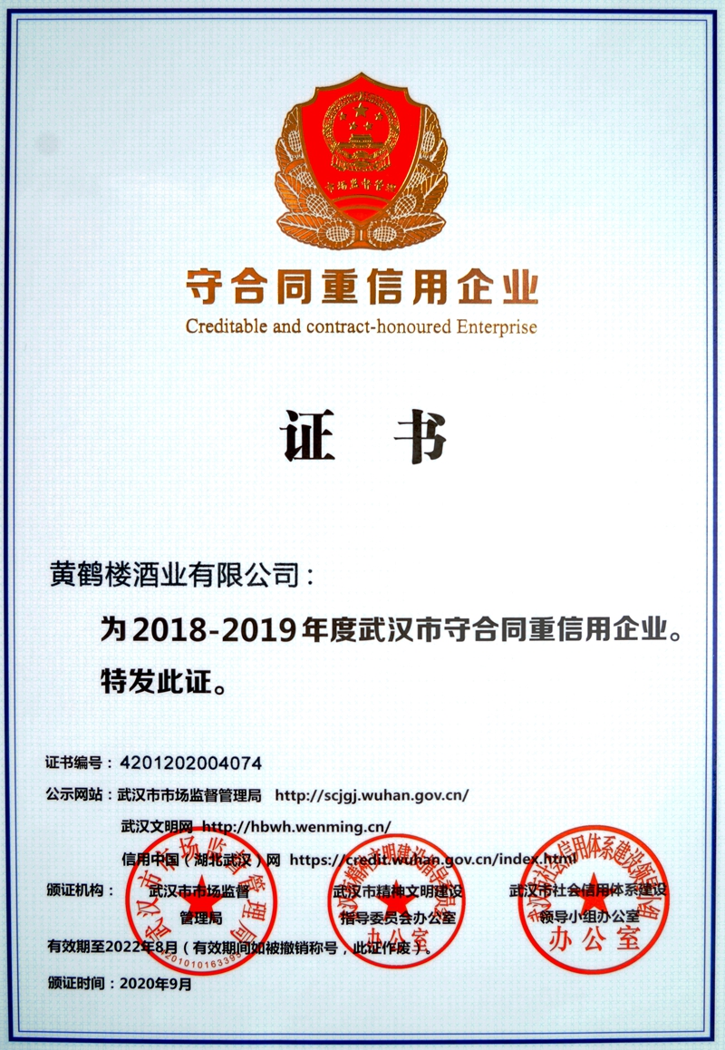 近日,黃鶴樓酒業分別獲得2018-2019年度湖北省、武漢市 “守合同重信用”企業榮譽稱號。