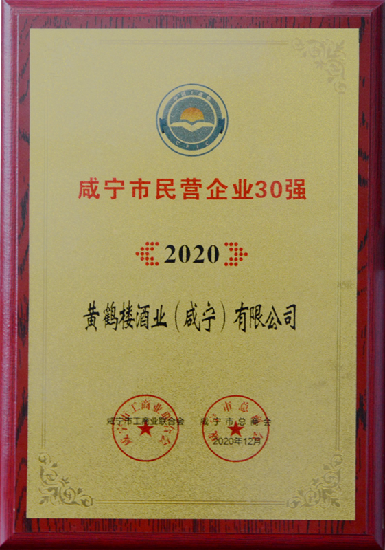 12月14日,黃鶴樓酒業(咸寧)有限公司榮獲“咸寧市民營企業30強”。