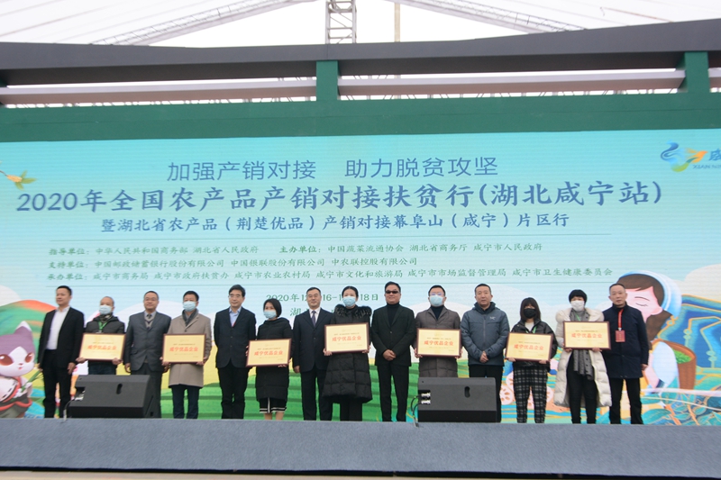 12月16日,由商務(wù)部和湖北省政府指導(dǎo),中國(guó)蔬菜流通協(xié)會(huì)、湖北省商務(wù)廳和咸寧市人民政府共同主辦的“2020年全國(guó)農(nóng)產(chǎn)品產(chǎn)銷對(duì)接扶貧行(湖北咸寧站)暨湖北省農(nóng)產(chǎn)品(荊楚優(yōu)品)產(chǎn)銷對(duì)接幕阜山(咸寧)片區(qū)行”活動(dòng)在咸寧市人民廣場(chǎng)啟幕。商務(wù)部流通產(chǎn)業(yè)促進(jìn)中心副主任安寶軍,湖北省商務(wù)廳黨組成員、副廳長(zhǎng)胡中海,咸寧市政府副市長(zhǎng)熊享濤,咸寧市政府副秘書(shū)長(zhǎng)鄢文軍,咸寧市商務(wù)局黨組書(shū)記、局長(zhǎng)傅火金等出席活動(dòng)。