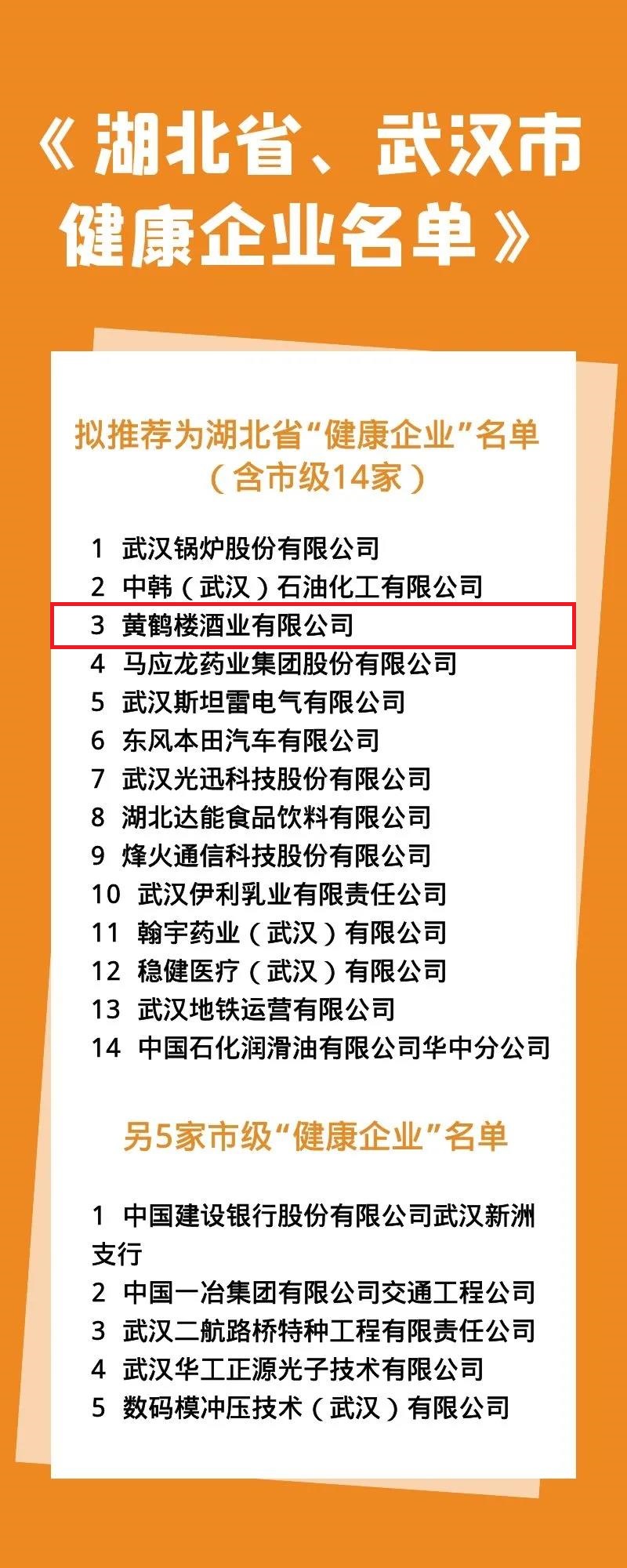 近日,2020年武漢市“健康企業(yè)”創(chuàng)建和評審結(jié)果揭曉。黃鶴樓酒業(yè)獲評市級“健康企業(yè)”榮譽,并將被推薦參評湖北省“健康企業(yè)”。