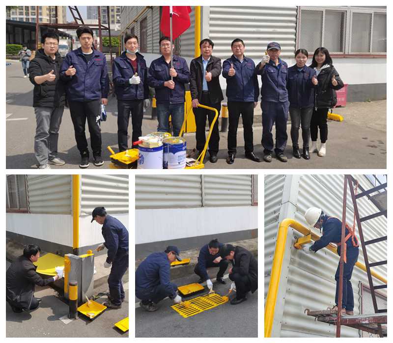 活動(dòng)中,各黨員、積極分子化身“油漆工”,對(duì)武漢廠區(qū)天然氣管道、雨水井蓋及標(biāo)識(shí)進(jìn)行了重新噴漆。深入基層、服務(wù)基層,在做好防護(hù)的前提下,大家輕裝上陣,紛紛投入井蓋刷漆、登高刷漆、地面防護(hù)等作業(yè)任務(wù)。經(jīng)過(guò)幾個(gè)小時(shí)的努力,廠區(qū)天然氣管道及雨水井蓋煥然一新,設(shè)施標(biāo)識(shí)更加醒目。