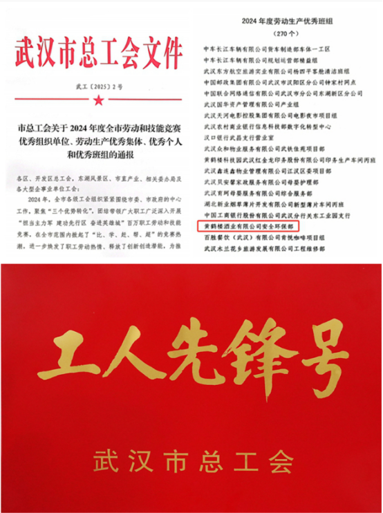 近日,武漢市總工會(huì)發(fā)布《市總工會(huì)關(guān)于2024年度全市勞動(dòng)和技能競(jìng)賽優(yōu)秀組織單位、勞動(dòng)生產(chǎn)優(yōu)秀集體、優(yōu)秀個(gè)人和優(yōu)秀班組的通報(bào)》(武工〔2025〕2號(hào)),其中,黃鶴樓酒業(yè)安全環(huán)保部榮獲“武漢市勞動(dòng)生產(chǎn)優(yōu)秀班組”“武漢市工人先鋒號(hào)”兩項(xiàng)榮譽(yù)。