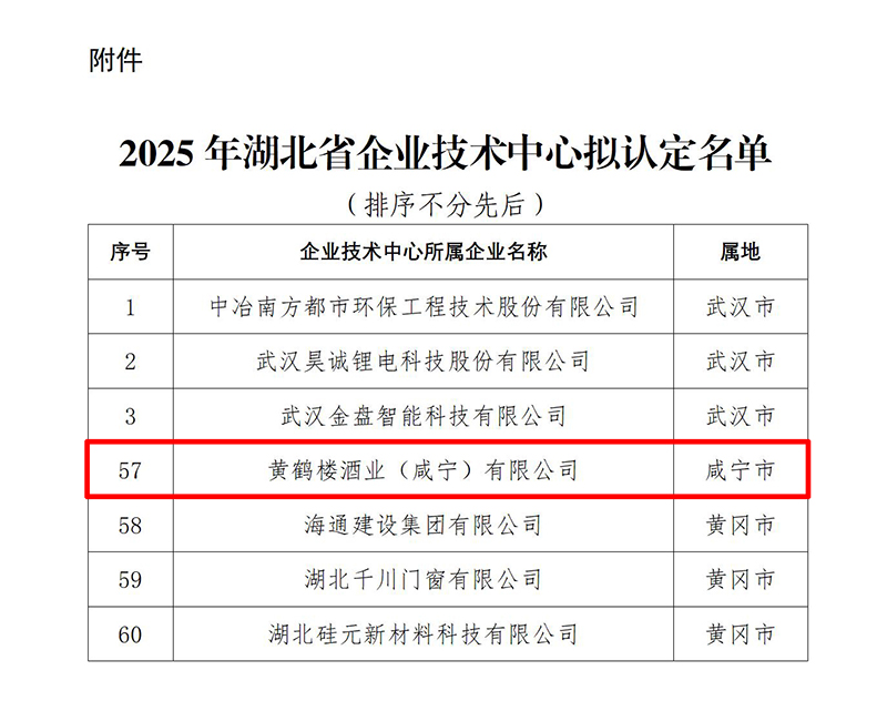 近日,湖北省發(fā)展和改革委員會發(fā)布了“2025年湖北省企業(yè)技術(shù)中心”認(rèn)定名單。黃鶴樓酒業(yè)(咸寧)有限公司憑借扎實的技術(shù)研發(fā)實力、系統(tǒng)化的創(chuàng)新體系和持續(xù)的產(chǎn)業(yè)引領(lǐng)能力成功躋身榜單。