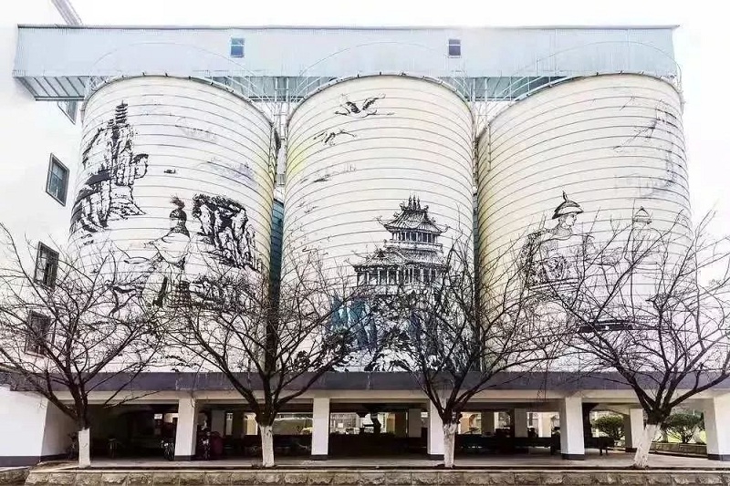 御酒糧倉是黃鶴樓酒業(yè)生產(chǎn)用糧的存儲庫,糧倉外部的彩繪分別為《周瑜江夏練兵用酒圖》《黃鶴樓仙酒傳說圖》《張之洞進獻用酒圖》,展示了黃鶴樓酒文化的起源與發(fā)展。