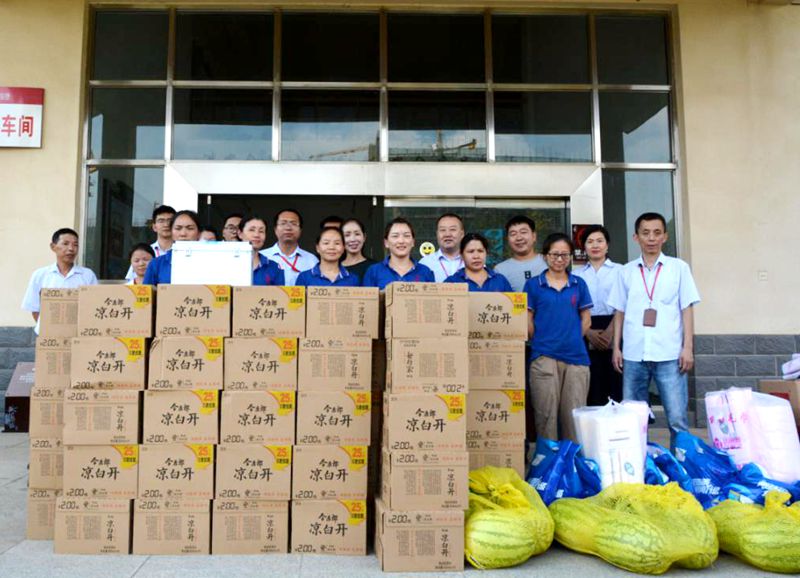 朱明鳳一行給黃鶴樓酒業(yè)員工送來了礦泉水、西瓜、醫(yī)藥箱及毛巾等物資,并對員工的工作和生活情況表示關(guān)心與關(guān)愛。